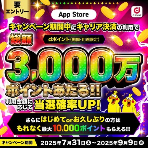 ドコモのポイントプログラム「dポイントクラブ」では、「【App Store】キャリア決済の利用でdポイントあたる!」キャンペーンを2025年7月31日(木曜)午前0:00~2025年9月9日(火曜)午後11:59まで実施している。期間中、キャンペーンサイトよりエントリーの…